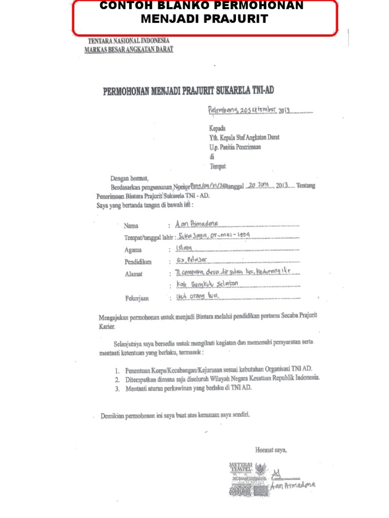 Tamtama tni ad gelombang i ta 2021. Memiliki kartu bpjs (badan penyelenggara ada tiga jalur seleksi untuk penerimaan tni angkatan darat (tni ad) yakni penerimaan bintara, tamtama dan taruna akademi militer (akmil). Melalui surat lamaran ini saya ingin mengajukan dir. Penerimaan calon tamtama (catam) dibuka untuk lulusan. Tamtama merupakan jalur pendaftaran tni pertama yang dapat kamu coba untuk bergabung bersama tni. Mendapatkan surat rekomendasi dari pimpinan fakultas/akademi dengan melampirkan transkrip studi persyaratan untuk mendaftar menjadi calon prajurit karier tni (khusus tenaga kesehatan). Tidak berkedudukan sebagai calon pegawai negeri sipil atau pegawai negeri sipil, prajurit tni, anggota polri, dan siswa sekolah ikatan dinas pemerintah Surat ini dibutuhkan guna melamar pekerjaan baru untuk kamu yang lulus kuliah, pindah kerja, cari suasana baru maupun fresh graduate. Contoh surat lamaran menjadi prajurit tulis tangan tinta. Surat lamaran kerja ini akan menjelaskan tentang profil calon pekerja apakah layak bekerja di perusahaan tersebut atau tidak. Contoh surat lamaran menjadi prajurit tamtama tni ad 2018. Maka dari itu setiap file dan informasi yang anda dapat jangan hanya dibaca. Surat lamaran masuk tni / polri.